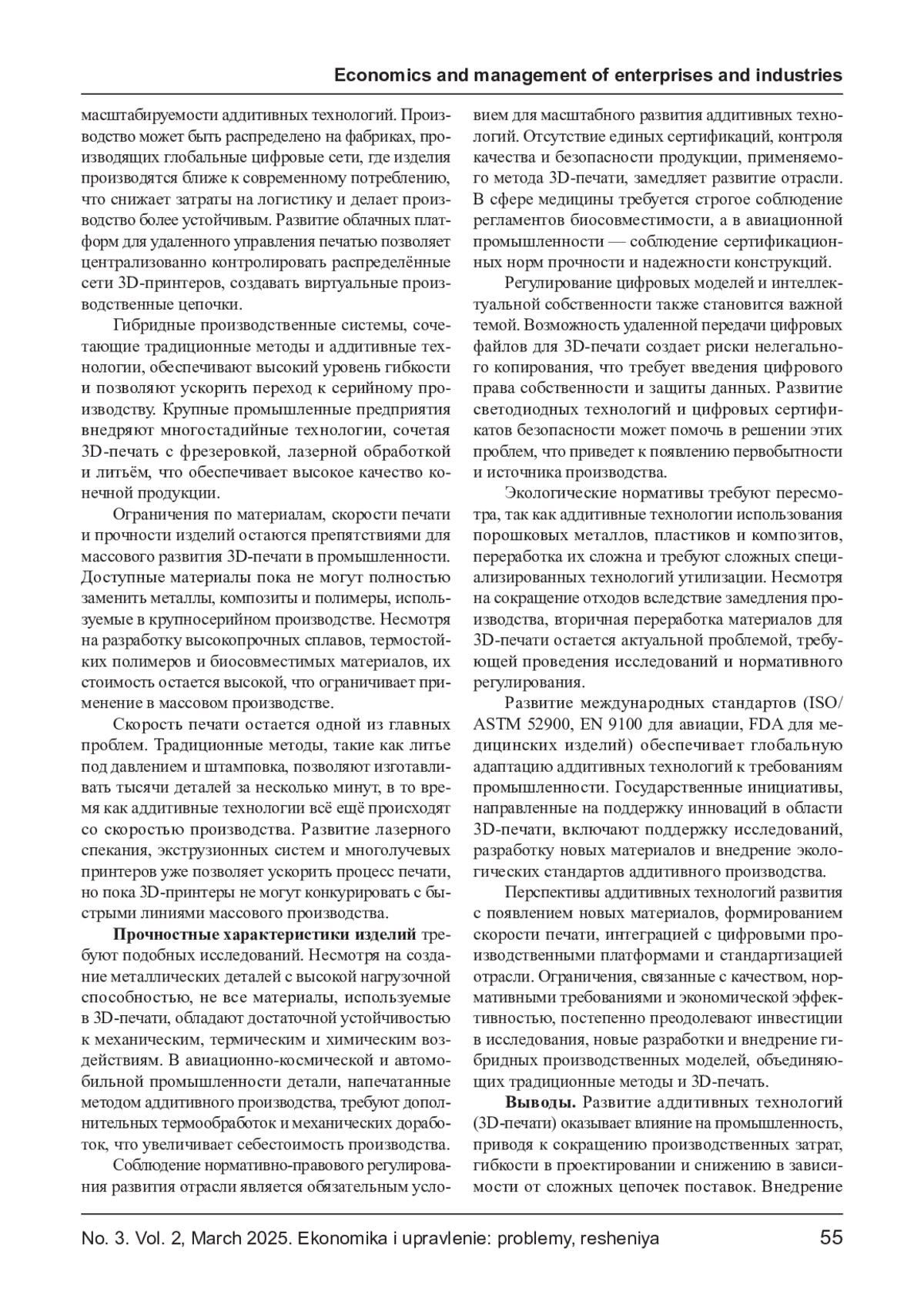 Развитие аддитивных технологий (3D-печати) оказывает влияние на промышленное производство, создавая новые возможности для снижения затрат, оптимизации процессов и повышения эффективности. Внедрение 3D-печати позволяет сократить расходы на материалы, логистику и доставку продукции, а также сократить сроки производства. В отличие от традиционных методов, аддитивное производство дает возможность создания сложных геометрических форм с потрясающими отходами, что повышает экологическую устойчивость производства. В статье рассматривается влияние преимуществ аддитивных технологий, их влияние на цепочки поставок, а также особенности применения в авиационно- космической, автомобильной, медицинской и строительной отраслях. Анализируются затраты на производство, сравниваются традиционные и цифровые методы производства, выявляются стандарты и ограничения массового развития 3D-печати в промышленности.