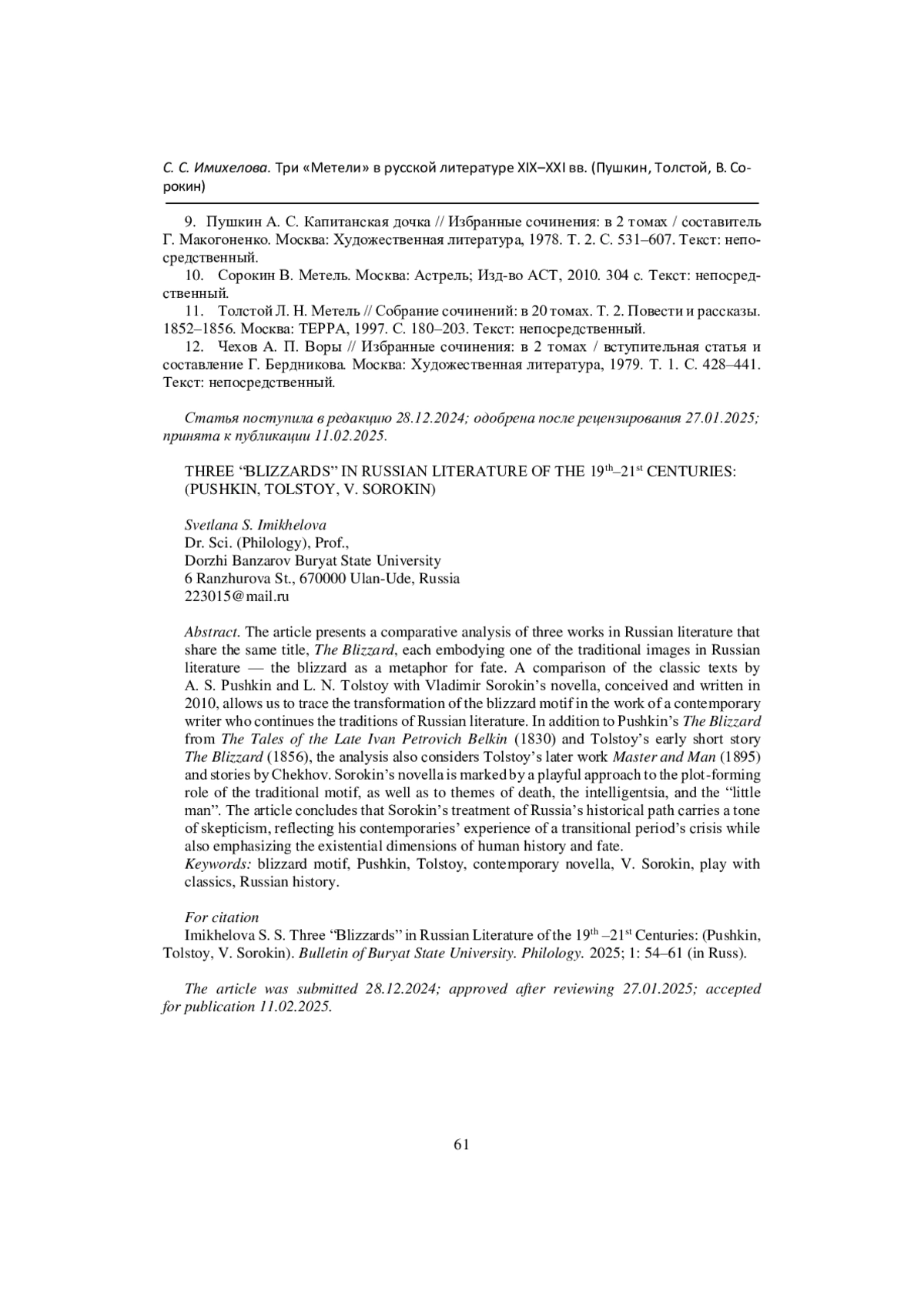 5. Завьялова Е. Е. Интеллигент и Божий человек из будущего: о главных героях повести В. Сорокина “Метель” // Вестник Томского государственного университета. 2015. № 397. С. 19-23. URL: https://joumals.tsu.ru/uploads/import/1284/files/397_019.pdf (дата обращения: 29.11.2024). Текст: электронный. EDN: UIBAEB