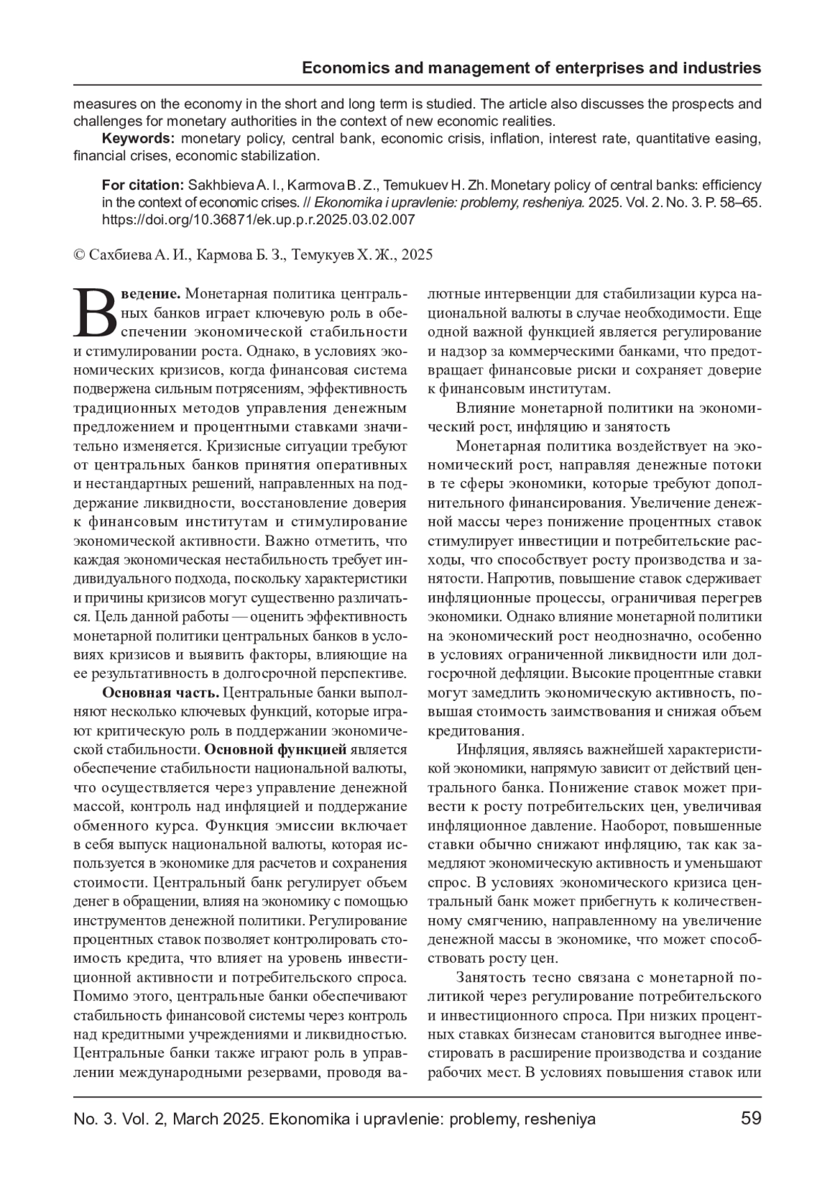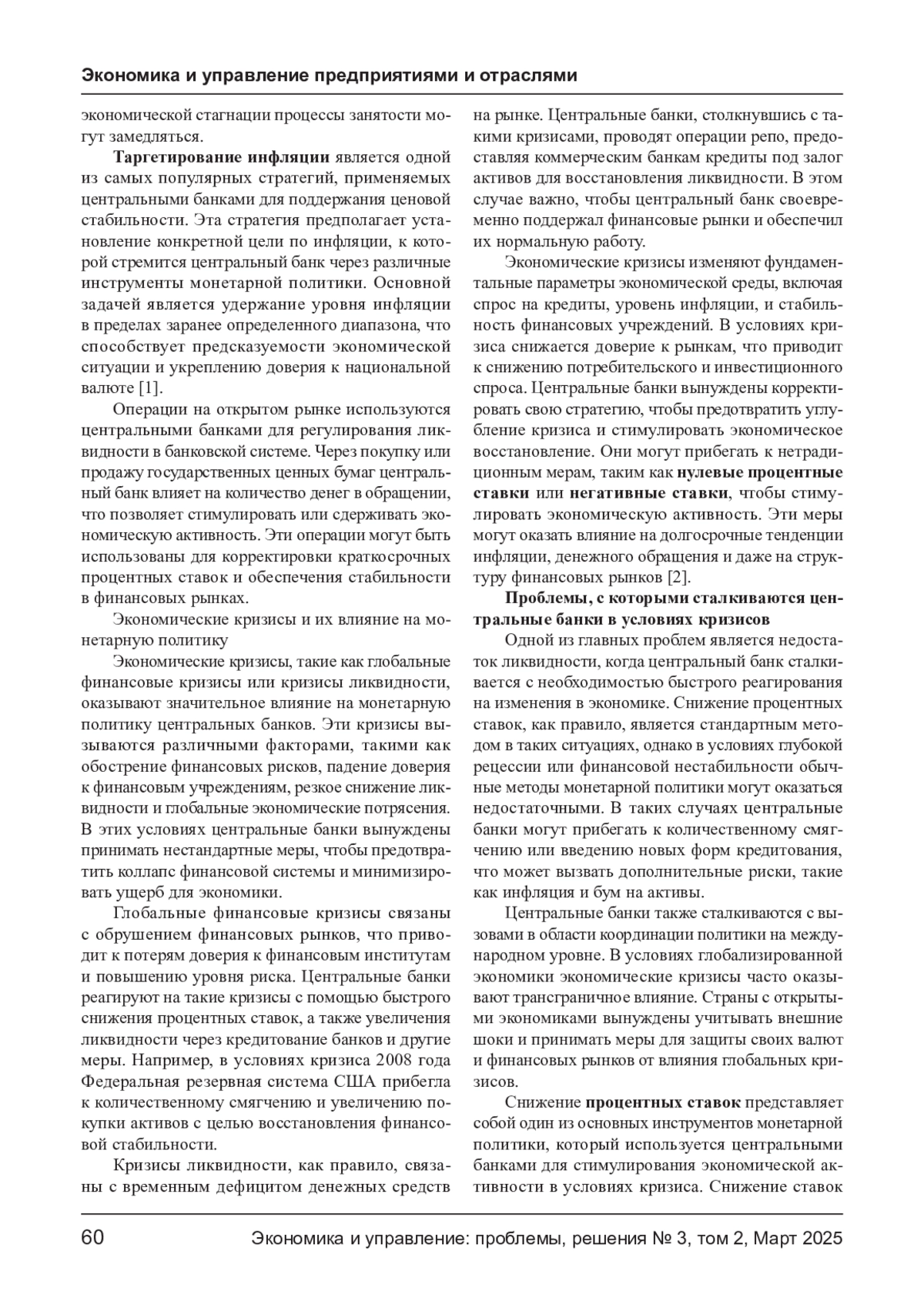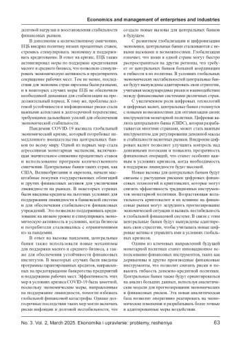 Статья посвящена анализу эффективности монетарной политики центральных банков в условиях экономических кризисов. Рассматриваются ключевые функции центральных банков, особенности их деятельности в условиях нестабильности на финансовых рынках. Особое внимание уделено анализу методов и инструментов, применяемых центральными банками для стабилизации экономики в кризисные периоды, таких как изменение процентных ставок, количественное смягчение и программы кредитования. На основе анализа исторических примеров исследуется влияние этих мер на экономику в краткосрочной и долгосрочной перспективе. В статье также обсуждаются перспективы и вызовы для монетарных властей в условиях новых экономических реалий.