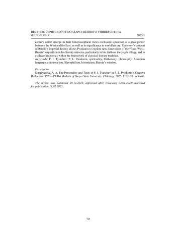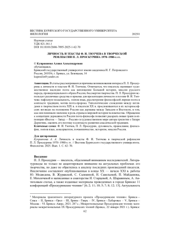 В статье рассматриваются причины возникновения интереса П. Л. Проскурина к личности и текстам Ф. И. Тютчева. Отмечается, что писатель оценивает художественное наследие поэта как воплощение Большой истории, миссии русского народа, провиденциального образа России, бессмертия творчества. П. Л. Проскурин использует различные средства и приемы для презентации личности и поэзии Ф. И. Тютчева: пафосную модальность, эзопов язык, рассмотрение философской лирики поэта в контексте традиции, мотив поэта-пророка. Типологические схождения между взглядами и творчеством поэта ХРХ в. и писателя ХХ в. прослеживаются в их историософских взглядах на положение России как державы между Западом и Востоком, в том, как они понимали значение и роль страны в мировой истории человечества. Обращение к концепции державности России поэта-философа позволяет раскрыть новые грани в оппозиции «Восток - Запад - Россия» в художественном мире автора трилогии о Захаре Дерюгине, оценить его поэтику в контексте развития классической традиции.