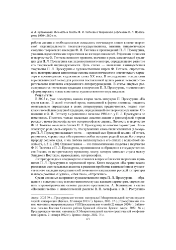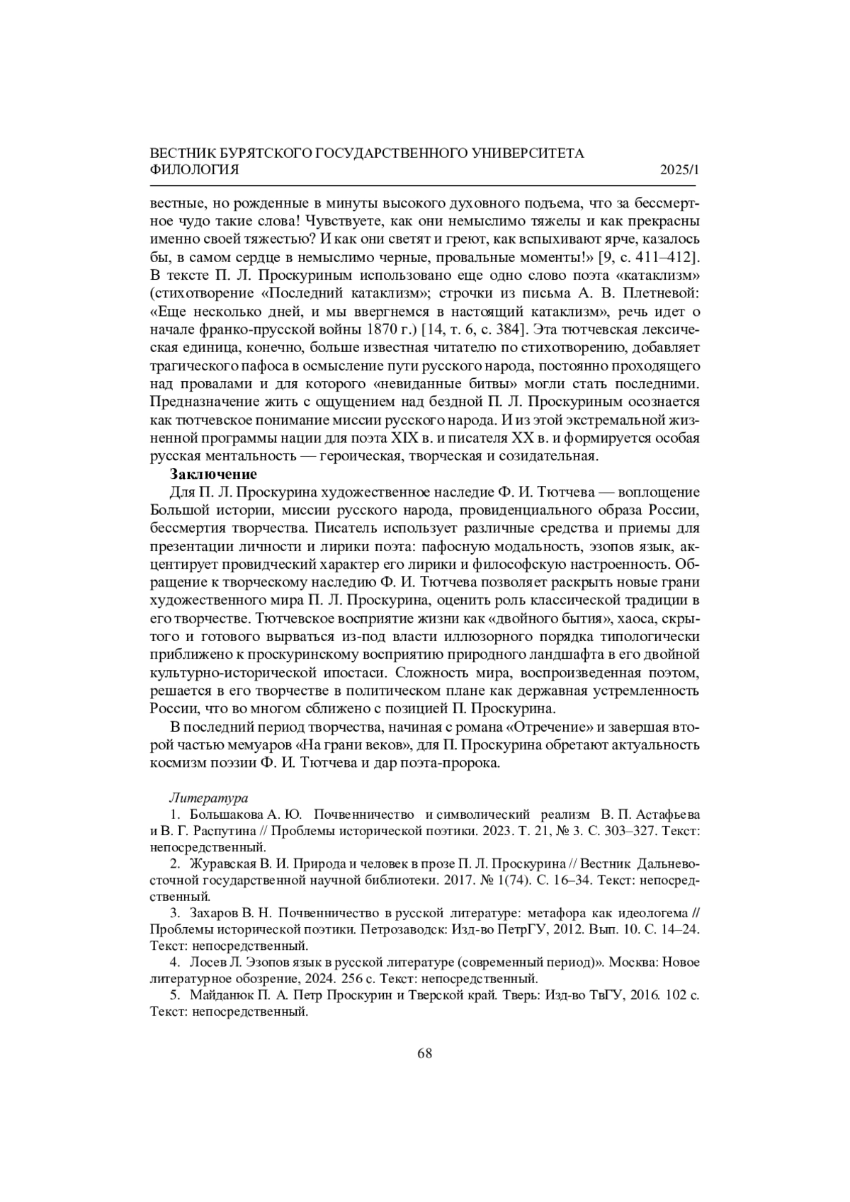 1. Большакова А. Ю. Почвенничество и символический реализм В. П. Астафьева и В. Г. Распутина // Проблемы исторической поэтики. 2023. Т. 21, № 3. С. 303-327. Текст: непосредственный. EDN: ZFCVGC