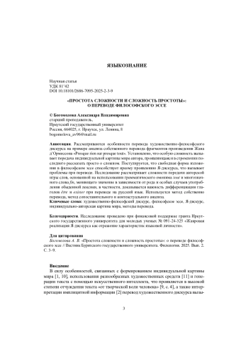 Рассматриваются особенности перевода художественно-философского дискурса на примере анализа собственного перевода фрагментов произведения Жана д’Ормессона «Presque rien sur presque tout». Установлено, что особую сложность вызывает передача индивидуальной картины мира автора, проявляющаяся в стремлении последнего рассказать просто о сложном. Постулируется, что свободная форма изложения в философском эссе способствует яркому проявлению Я-дискурса, что вызывает проблемы при переводе. Исследование рассматривает сложности передачи авторской игры слов, основанной на использовании грамматического омонима tout и многозначного слова fin, меняющего значение в зависимости от рода и особых случаев употребления обыденной лексики, в частности, доказывается важность дифференциации глаголов etre и exister при переводе на русский язык. Используется метод собственно перевода, метод сопоставительного и контекстуального анализа.