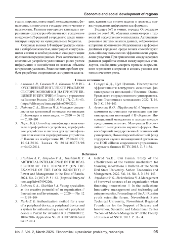 1. АлешковА.В., СинюковВ.А., ИвашкинМ.В. ИСКУССТВЕННЫЙ ИНТЕЛЛЕКТ В РЕАЛЬНОМ СЕКТОРЕ ЭКОНОМИКИ (НА ПРИМЕРЕ ПИЩЕВОЙ ИНДУСТРИИ) // Власть и управление на Востоке России. 2024. № 2 (107). С. 51-63.(item.asp?id=67999220). EDN: LVZVTN