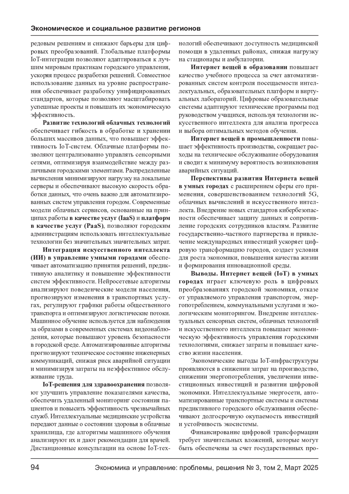 Развитие умных городов требует внедрения интернета вещей (IoT) в городскую инфраструктуру для оптимизации управления и повышения качества жизни. Внедрение IoT-решений обеспечивает сокращение затрат, развитие цифровой экономики и увеличение инвестиционной привлекательности городов. Экономическая эффективность таких систем обусловила снижение энергопотребления, автоматизацию коммунальных услуг и повышение эффективности управления потоками. Однако цифровизация городской среды связана с рисками, включая киберугрозу, высокими затратами на модернизацию и необходимостью разработки гибких регуляторных принципов. В статье проводится экономический анализ IoT-инфраструктуры городского бюджета, рассматривается источник финансирования цифровой трансформации и рассматриваются перспективы использования передовых технологий в городском управлении.