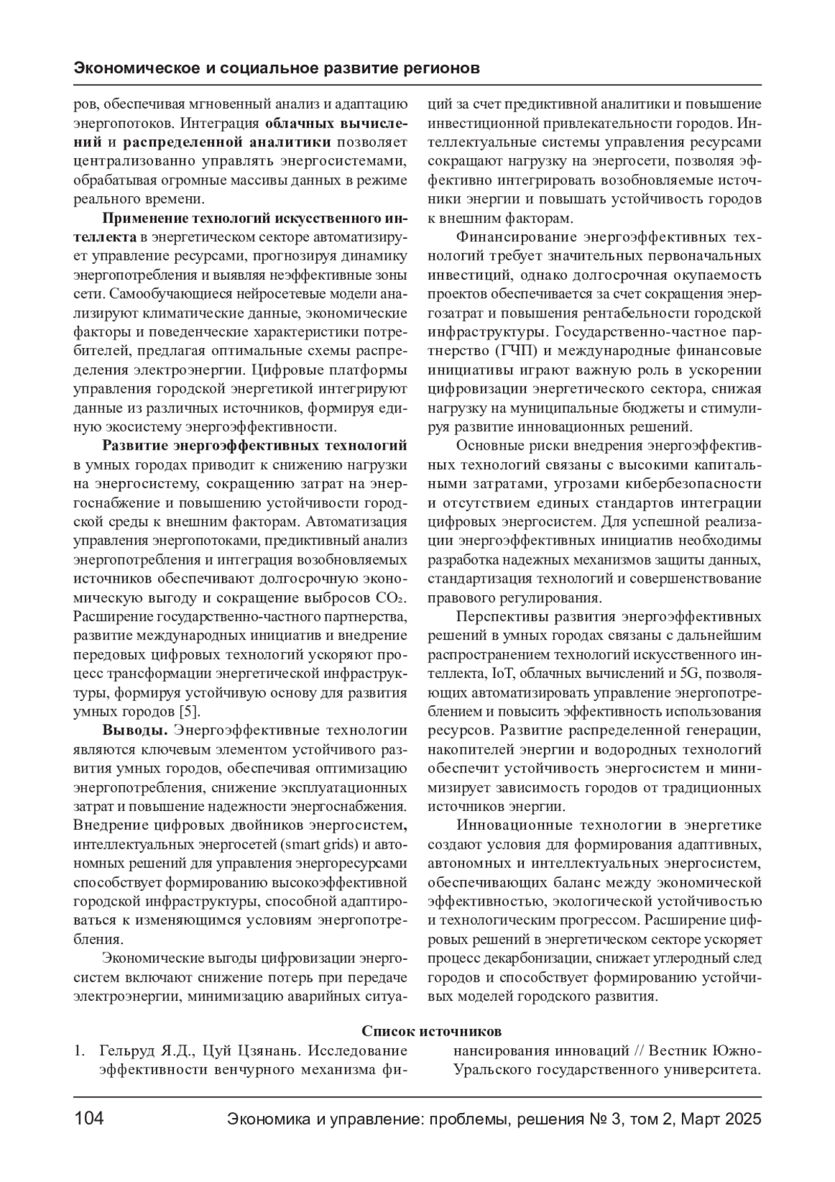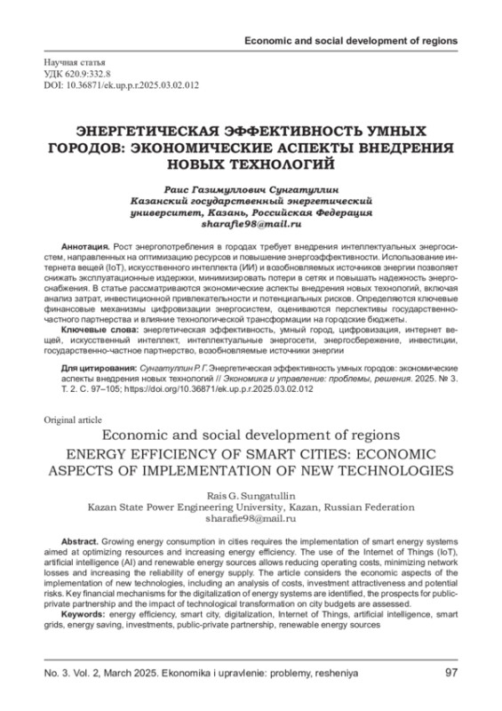 Рост энергопотребления в городах требует внедрения интеллектуальных энергосистем, направленных на оптимизацию ресурсов и повышение энергоэффективности. Использование интернета вещей (IoT), искусственного интеллекта (ИИ) и возобновляемых источников энергии позволяет снижать эксплуатационные издержки, минимизировать потери в сетях и повышать надежность энергоснабжения. В статье рассматриваются экономические аспекты внедрения новых технологий, включая анализ затрат, инвестиционной привлекательности и потенциальных рисков. Определяются ключевые финансовые механизмы цифровизации энергосистем, оцениваются перспективы государственно-частного партнерства и влияние технологической трансформации на городские бюджеты.