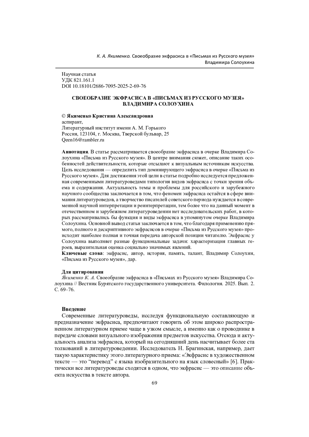 В статье рассматривается своеобразие экфрасиса в очерке Владимира Солоухина «Письма из Русского музея». В центре внимания сюжет, описание таких особенностей действительности, которые отсылают к визуальным источникам искусства. Цель исследования - определить тип доминирующего экфрасиса в очерке «Письма из Русского музея». Для достижения этой цели в статье подробно исследуется предложенная современными литературоведами типология видов экфрасиса с точки зрения объема и содержания. Актуальность темы и проблемы для российского и зарубежного научного сообщества заключается в том, что феномен экфрасиса остаётся в сфере внимания литературоведов, а творчество писателей советского периода нуждается в современной научной интерпретации и реинтерпретации, тем более что на данный момент в отечественном и зарубежном литературоведении нет исследовательских работ, в которых рассматривались бы функция и виды экфрасиса в упомянутом очерке Владимира Солоухина. Основной вывод статьи заключается в том, что благодаря применению прямого, полного и дескриптивного экфрасисов в очерке «Письма из Русского музея» происходит наиболее полная и точная передача авторской позиции читателю. Экфрасис у Солоухина выполняет разные функциональные задачи: характеризация главных героев, выразительная оценка социально значимых явлений