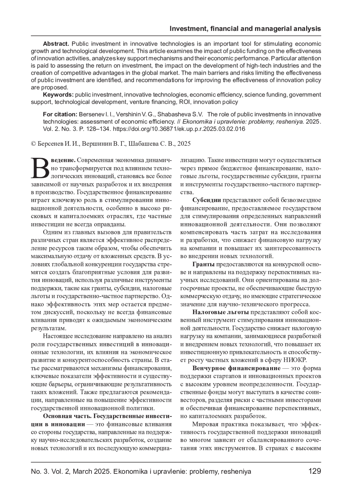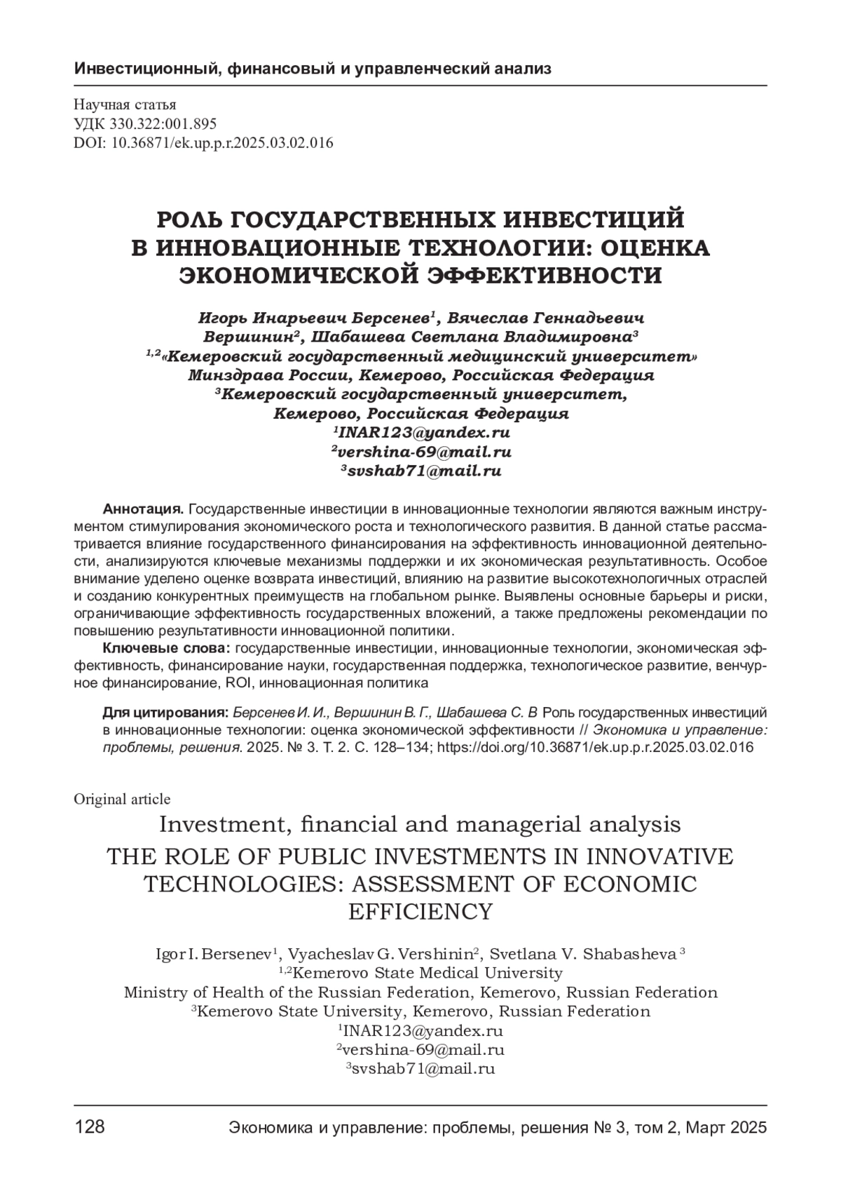 Государственные инвестиции в инновационные технологии являются важным инструментом стимулирования экономического роста и технологического развития. В данной статье рассматривается влияние государственного финансирования на эффективность инновационной деятельности, анализируются ключевые механизмы поддержки и их экономическая результативность. Особое внимание уделено оценке возврата инвестиций, влиянию на развитие высокотехнологичных отраслей и созданию конкурентных преимуществ на глобальном рынке. Выявлены основные барьеры и риски, ограничивающие эффективность государственных вложений, а также предложены рекомендации по повышению результативности инновационной политики.