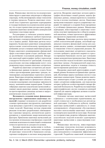Развитие квантовых связей открывает новые возможности для финансовых рынков, способствует ускоренной обработке данных, оптимизации стратегий и повышению эффективности управления рисками. Квантовые алгоритмы, обладая экспоненциальной вычислительной мощностью, способны решать задачи, имеющиеся для классических компьютеров, что делает их перспективными для высокочастотного трейдинга, стресс- тестирования банковских систем и анализа ликвидности. Внедрение квантовой криптографии и оптимизационных алгоритмов меняет подход к безопасности финансовых операций и прогнозированию динамики активов. В статье рассматриваются основные направления использования квантовых компьютеров в финансах, анализируются их последствия, потенциальные угрозы и регуляторные вызовы. Особое внимание уделяется влиянию квантовой революции на финансовый сектор экономики и возможности ее перехода к новым технологиям.