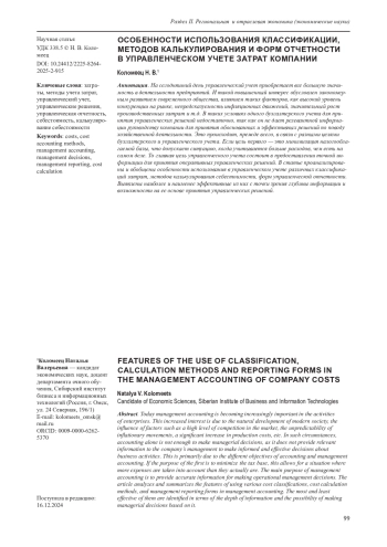 На сегодняшний день управленческий учет приобретает все большую значимость в деятельности предприятий. И такой повышенный интерес обусловлен закономерным развитием современного общества, влиянием таких факторов, как высокий уровень конкуренции на рынке, непредсказуемость инфляционных движений, значительный рост производственных затрат и т. д. В таких условиях одного бухгалтерского учета для принятия управленческих решений недостаточно, так как он не дает релевантной информации руководству компании для принятия обоснованных и эффективных решений по поводу хозяйственной деятельности. Это происходит, прежде всего, в связи с разными целями бухгалтерского и управленческого учета. Если цель первого — это минимизация налогооблагаемой базы, что допускает ситуацию, когда учитывается больше расходов, чем есть на самом деле. То главная цель управленческого учета состоит в предоставлении точной информации для принятия оперативных управленческих решений. В статье проанализированы и обобщены особенности использования в управленческом учете различных классификаций затрат, методов калькулирования себестоимости, форм управленческой отчетности. Выявлены наиболее и наименее эффективные из них с точки зрения глубины информации и возможности на ее основе принятия управленческих решений.