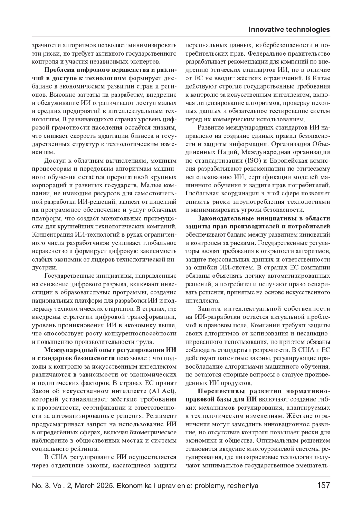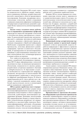 Внедрение искусственного интеллекта (ИИ) в бизнес- процессы становится ключевым фактором повышения экономической эффективности, снижая операционные издержки, увеличивая производительность и оптимизируя принятие управленческих решений. Автоматизация позволяет предприятиям ускорять обработку данных, персонализировать взаимодействие с клиентами и прогнозировать рыночные тренды, что обеспечивает конкурентные преимущества. Однако процесс интеграции ИИ сопряжён с финансовыми затратами, рисками кибербезопасности и изменениями на рынке труда. В статье рассматриваются экономические выгоды внедрения ИИ в различных секторах, включая финансы, промышленность, торговлю и здравоохранение, анализируются инвестиционные аспекты цифровой трансформации, а также исследуются потенциальные риски и регуляторные вызовы. Оценивается влияние ИИ на рынок труда, роль государственных инициатив в поддержке инноваций и перспективы формирования новой экономической модели на основе интеллектуальных технологий.