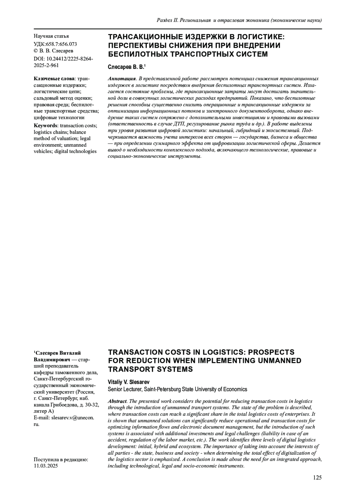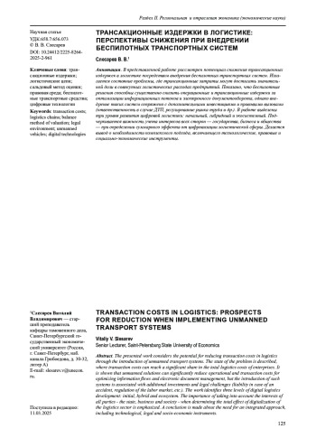 В представленной работе рассмотрен потенциал снижения трансакционных издержек в логистике посредством внедрения беспилотных транспортных систем. Излагается состояние проблемы, где трансакционные затраты могут достигать значительной доли в совокупных логистических расходах предприятий. Показано, что беспилотные решения способны существенно снизить операционные и трансакционные издержки за оптимизации информационных потоков и электронного документооборота, однако внедрение таких систем сопряжено с дополнительными инвестициями и правовыми вызовами (ответственность в случае ДТП, регулирование рынка труда и др.). В работе выделены три уровня развития цифровой логистики: начальный, гибридный и экосистемный. Подчеркивается важность учета интересов всех сторон — государства, бизнеса и общества — при определении суммарного эффекта от цифровизации логистической сферы. Делается вывод о необходимости комплексного подхода, включающего технологические, правовые и социально-экономические инструменты.