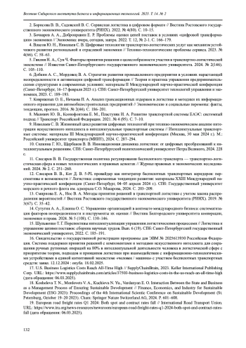 12. Слесарев В. В., Кот Д. В. 5-PL провайдер как интегратор беспилотных транспортных коридоров: перспективы и возможности // Логистика: современные тенденции развития: материалы XXIII Международной научно-практической конференции (Санкт-Петербург, 04-05 апреля 2024 г.). СПб: Государственный университет морского и речного флота им. адмирала С.О. Макарова, 2024. С. 203-209.