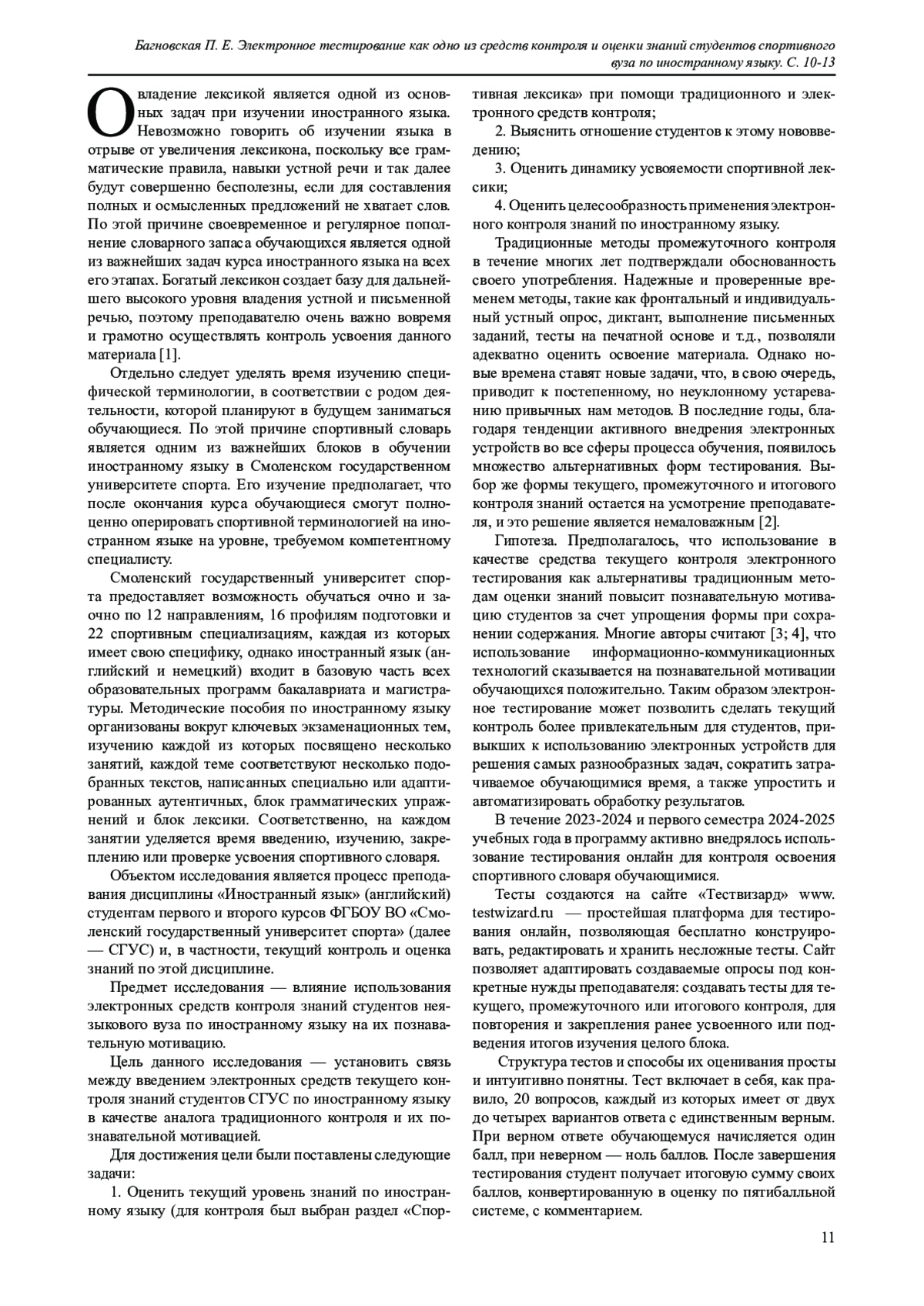Статья посвящена анализу мотивации студентов неязыкового высшего учебного заведения (на примере обучающихся первого и второго курсов ФГБОУ ВО «СГУС») к изучению иностранного языка. Выделяется и рассматривается как важнейший компонент изучения иностранного языка пополнение словарного запаса студентов в контексте их будущей профессии, рассматриваются традиционные способы контроля освоения профессионально значимой иноязычной лексики, также сравнительно более инновационный электронный контроль в форме онлайн тестов. Анализируется успеваемость обучающихся и их субъективное отношение к изучению иностранного языка, оценке собственных знаний и инновационным методам контроля. Работа является частью исследования познавательной мотивации студентов неязыкового вуза и влияния на нее оценочных средств, и ее итогом стало решение использовать электронный контроль знаний наряду с традиционными методами контроля при преподавании иностранного языка в Смоленском государственном университете спорта.