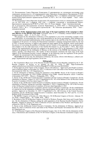 18. Постановление Совета Народных Комиссаров. О мероприятиях по улучшению постановки дела ликвидации неграмотности и об операционном плане Народного Комиссариата Просвещения РСФСР по ликвидации неграмотности на 1926-1927 год. 19 февраля 1927 г. // Собрание узаконений и распоряжений Рабоче-Крестьянского правительства РСФСР за 1927 г. № 1-54. Отдел первый. - Текст: непосредственный.