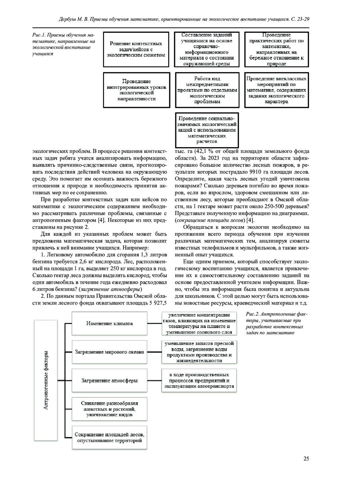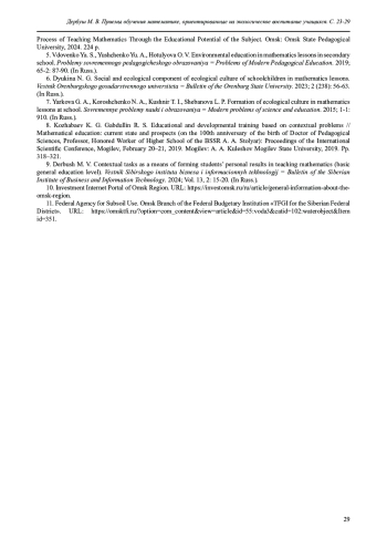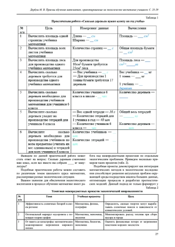 В статье рассматриваются вопросы организации процесса обучения математике с целью экологического воспитания обучающихся, что является составляющей личностных результатов, указанных в Федеральных образовательных программах основного общего и среднего общего образования. Математика, являясь одним из основных предметов в школьной программе, сосредоточена на развитии логического мышления, вычислительных навыков и других интеллектуальных способностей учащихся, а интеграция экологических аспектов в процесс обучения будет способствовать формированию у них ответственного отношения к природе. Цель работы — проанализировать содержание понятия «экологическое воспитание» и выделить приемы обучения математике, направление на достижение личностных результатов экологической направленности. Научная новизна исследования заключается в том, что обоснована необходимость использования в процессе обучения математике комплекса специальных приемов, среди которых решение контекстных задач/кейсов с экологическим сюжетом; составление заданий учащимися на основе справочно-информационного материала о состоянии окружающей среды; проведение практических работ по математике, направленных на бережное отношение к природе; проведение интегрированных уроков экологической направленности; выполнение межпредметных проектов по отдельным экологическим проблемам; проведение внеклассных мероприятий по математике, содержащих задания экологического характера; проведение социально-значимых акций с математическим обоснованием их результатов, которые будут способствовать экологическому воспитанию учащихся за счет возможностей учебного предмета. В статье приводятся примеры реализации указанных приемов в процессе обучения математике. Полученные результаты могут быть использованы в практике работы учителей математики.