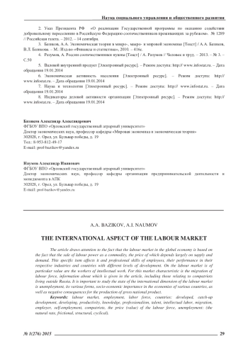 В статье обращается внимание на то, что рынок труда в мировой экономике основывается на факте купли-продажи рабочей силы как товара, цена которого во многом зависит от предложения и спроса. На этот специфический товар влияют и профессиональные способности работающих, их производительность в соответствующих производствах и странах с различным уровнем развития. На рынке труда особую ценность имеют работники интеллектуального труда. Для рассматриваемого рынка характерной является миграция рабочей силы, сведения о которой приводятся в статье, в том числе касающиеся соотечественников проживающих за пределами России. Важным для изучения состояния международного аспекта рынка труда является безработица, её различные формы, социально-экономическое значение в экономиках различных стран, а также негативные последствия для производства валового национального продукта