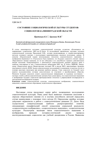 4. Проданцов К.С., Храмова М.В. Социологическая культура педагога: место и роль в системе педагогического образования / К.С. Проданцов, М.В. Храмова // Психолого-педагогический журнал Гаудеамус. - 2023. - Т. 22. - № 2. - С. 23-35. EDN: RSFIOS