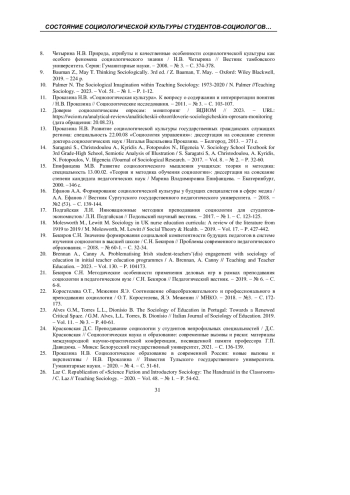 10. Palmer N. The Sociological Imagination within Teaching Sociology: 1973-2020 / N. Palmer //Teaching Sociology. - 2023. - Vol. 51. - № 1. - P. 1-12. EDN: JPHCIU