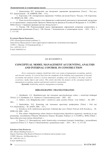 6. Попова, Л.В. Ретроспективный анализ формирования современной концепции контроллинга в промышленной организации [Текст] / Л.В. Попова // Экономические и гуманитарные науки. - 2014. - № 4. - С. 113-120. EDN: SDVONZ