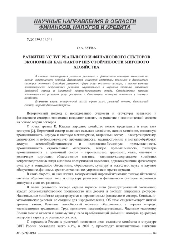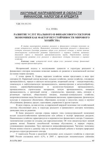 В статье анализируется развитие реального и финансового секторов экономики на основе исторического подхода. Выявляются изменения структуры реального и финансового секторов экономики благодаря развитию сферы услуг реального сектора, а также важные закономерности особенностей развития национального и мирового хозяйств, вызванные динамикой спроса и динамикой производительности труда. Определяются важные закономерности развития услуг реального и финансового секторов экономики в мировом хозяйстве