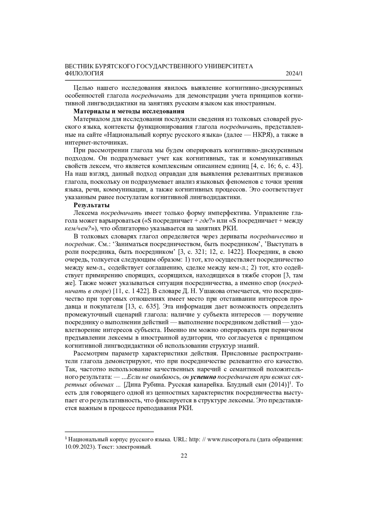 Целью статьи явилось описание семантико-когнитивных и дискурсивных особенностей лексемы посредничать с позиции когнитивной лингводидактики. Рассматриваются постулаты когнитивной лингводидактики, доказывается целесообразность их использования на занятиях русским языком как иностранным. Выявляются значимые когнитивно-дискурсивные свойства глагола посредничать, а также его когнитивная структура. Новизна исследования видится в том, что представление лексических единиц с позиции когнитивной лингводидактики дает возможность проиллюстрировать ключевые характеристики слова, обнаружить стоящие за ним структуры знания, что облегчает представление и закрепление новых слов в иностранной аудитории. Актуальность работы обусловлена вхождением глагола посредничать в важную для носителей языка лексико-семантическую группу глаголов помощи, отсутствием когнитивно-дискурсивного описания глагола в научных исследованиях, недостаточностью информации в словарях русского языка. Описываются семантико-когнитивные, ситуативные и дискурсивные признаки лексемы, выявляются компоненты когнитивной структуры глагола, конструируются сценарии. Устанавливаются важные для предъявления в иностранной аудитории свойства единицы посредничать.