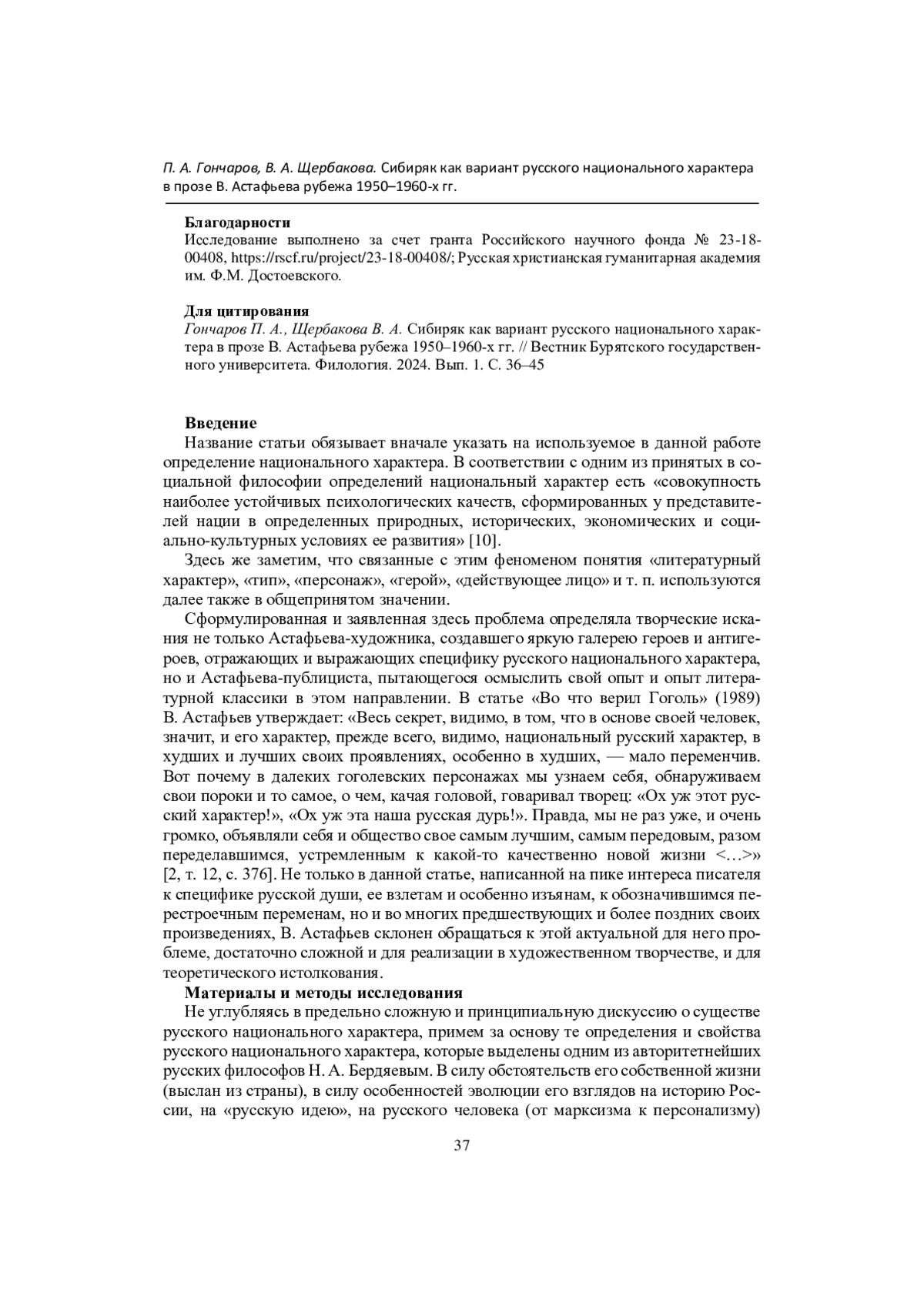 В статье исследуется специфика характера сибиряка, представленная и осмысленная в рассказах и повестях В. Астафьева. Актуальность исследования обусловлена вниманием современного литературоведения к историософской составляющей проблематике русской прозы, необходимостью изучения произведений русской литературы ХХ в. в ее эволюции, наиболее ярких проявлениях и оценках. Целью данного исследования является определение особенностей созданного в рассказах и повестях В. Астафьева характера сибиряка в качестве варианта русского национального характера. С помощью биографического, историко-функционального и текстологического методов анализируются рассказы В. Астафьева «Гражданский человек», «Сибиряк», повести «Перевал», «Стародуб», публицистические произведения писателя. Рассматриваются различные взгляды на особенности русского национального характера. В результате проведенного анализа установлено, что в рассказах и повестях В. Астафьева создан яркий образ героя-сибиряка, храброго воина, готового к самопожертвованию, закаленного в суровых условиях жизни Сибири, трудолюбивого, знающего и чувствующего природу. Редактирование Астафьевым его первого рассказа шло по пути акцентирования сибирского происхождения его главного героя. Доказано, что астафьевский сибиряк заключает в себе коренные свойства русского национального характера, дополненные качествами, связанными с особыми этногеографическими обстоятельствами истории и современности Сибири. Сделаны выводы о том, что астафьевский сибиряк является вариантом русского национального характера, указано, что в последующем зрелом и позднем творчестве В. Астафьева усилено внимание писателя к судьбе героев-сибиряков.