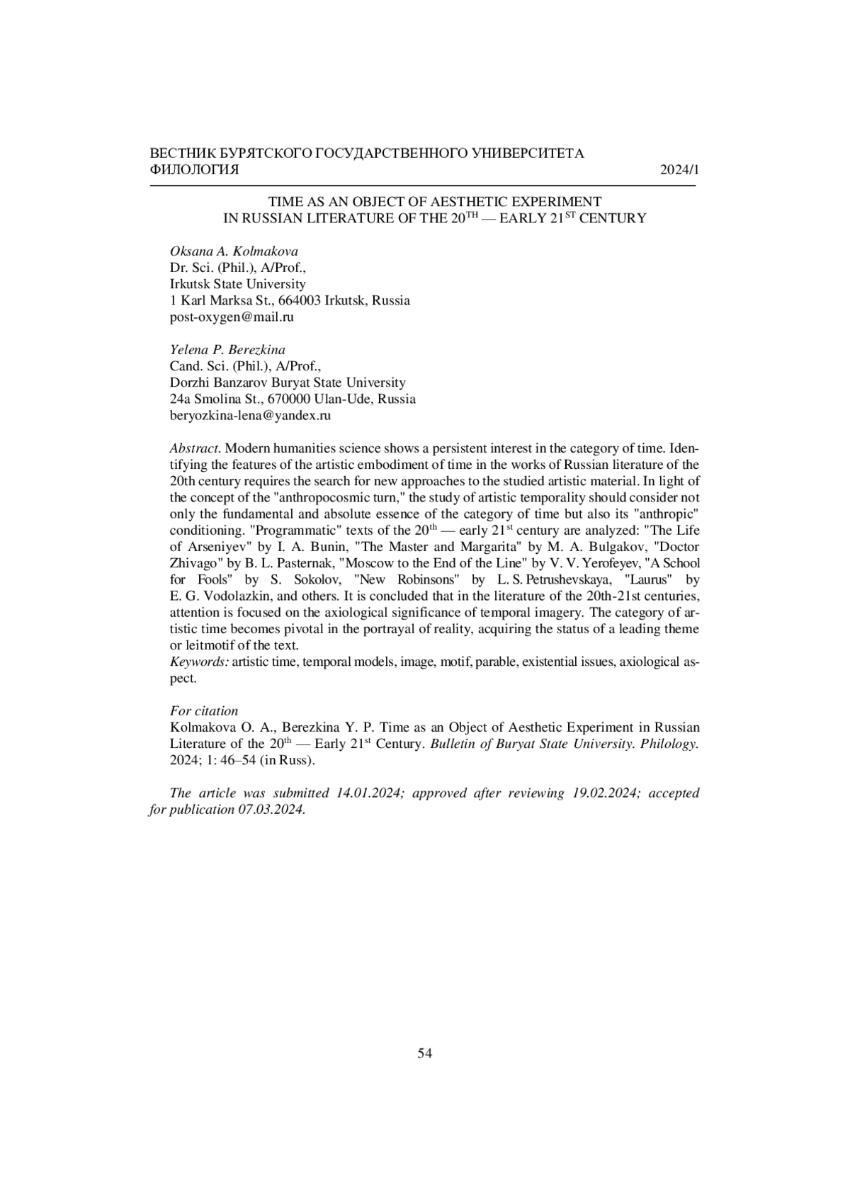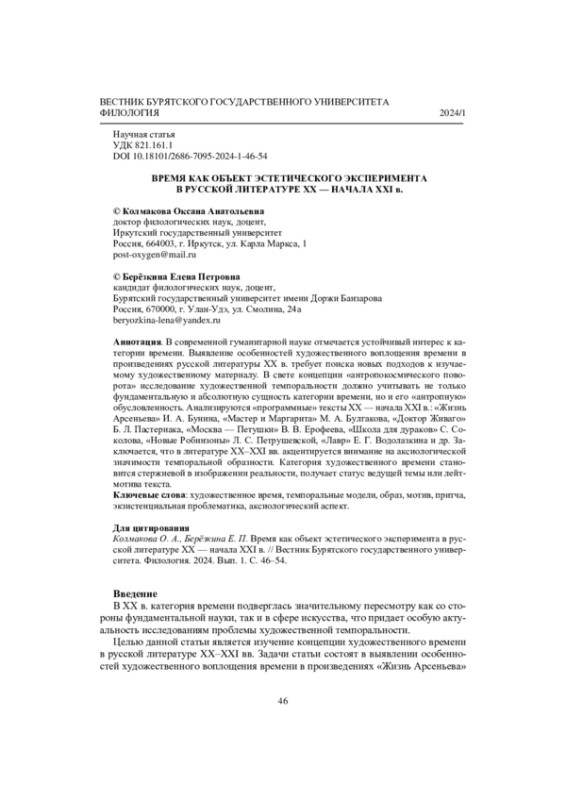 В современной гуманитарной науке отмечается устойчивый интерес к категории времени. Выявление особенностей художественного воплощения времени в произведениях русской литературы ХХ в. требует поиска новых подходов к изучаемому художественному материалу. В свете концепции «антропокосмического поворота» исследование художественной темпоральности должно учитывать не только фундаментальную и абсолютную сущность категории времени, но и его «антропную» обусловленность. Анализируются «программные» тексты ХХ - начала XXI в.: «Жизнь Арсеньева» И. А. Бунина, «Мастер и Маргарита» М. А. Булгакова, «Доктор Живаго» Б. Л. Пастернака, «Москва - Петушки» В. В. Ерофеева, «Школа для дураков» С. Соколова, «Новые Робинзоны» Л. С. Петрушевской, «Лавр» Е. Г. Водолазкина и др. Заключается, что в литературе ХХ-XXI вв. акцентируется внимание на аксиологической значимости темпоральной образности. Категория художественного времени становится стержневой в изображении реальности, получает статус ведущей темы или лейтмотива текста.
