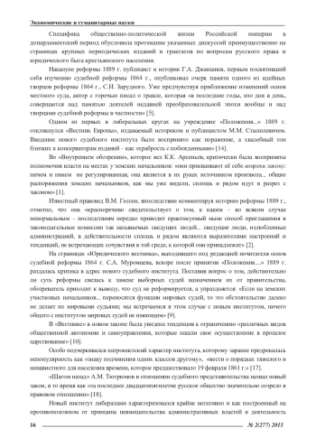 В статье впервые рассматривается реакция либеральной общественности в конце XIX в. на учреждение земских начальников. Представляются основные позиции либеральных общественно-политических изданий, юристов и публицистов. На базе изученных источников автор делает вывод, что отношение либеральных кругов к земским начальникам формировалось преимущественно исходя из собственных политических идеалов