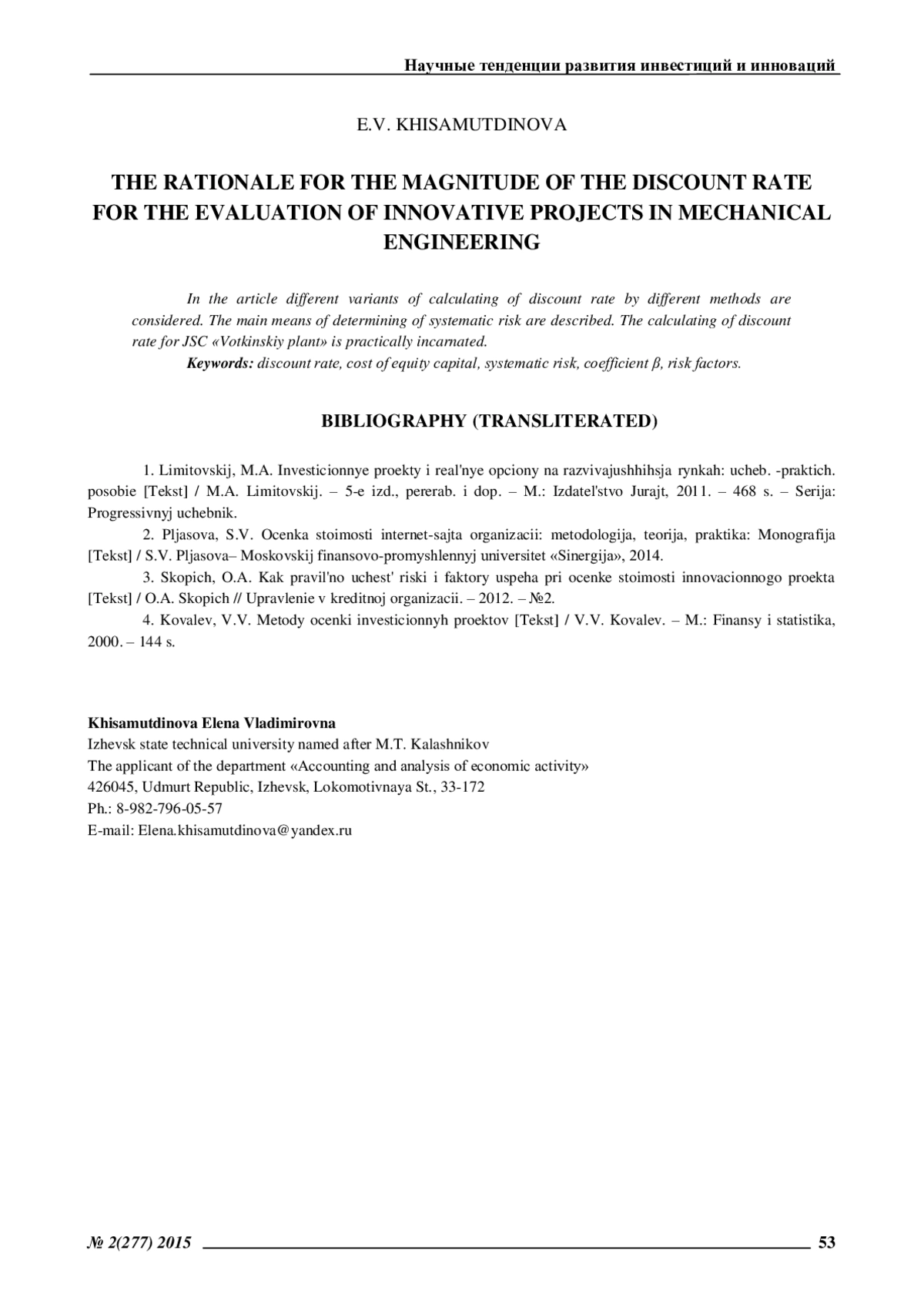 ХИСАМУТДИНОВА Е. В. ОБОСНОВАНИЕ ВЕЛИЧИНЫ СТАВКИ ДИСКОНТИРОВАНИЯ ДЛЯ ОЦЕНКИ ИННОВАЦИОННЫХ ПРОЕКТОВ В МАШИНОСТРОЕНИИ // ЭКОНОМИЧЕСКИЕ И ГУМАНИТАРНЫЕ НАУКИ. 2015. № 2 (277)