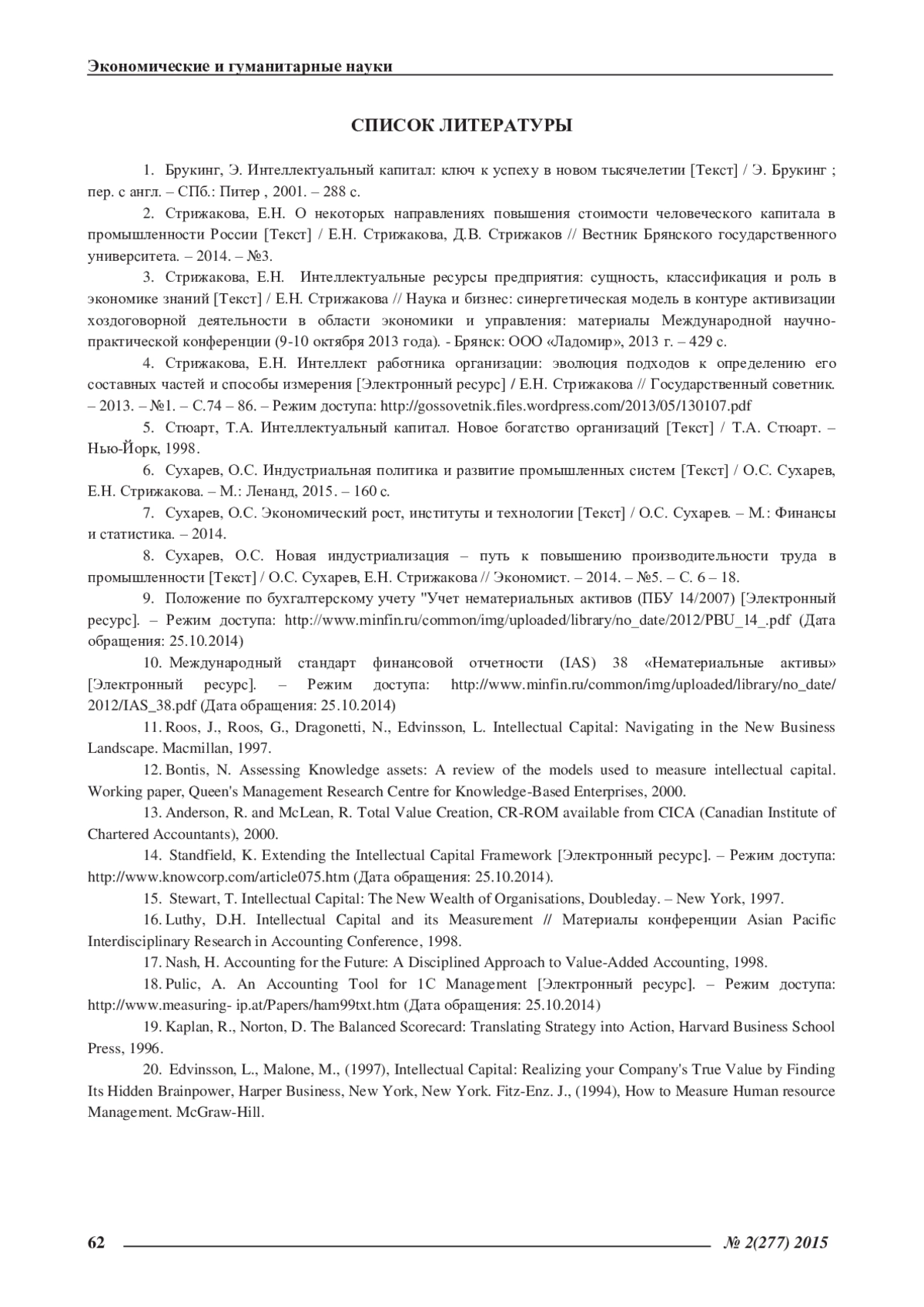2. Стрижакова, Е.Н. О некоторых направлениях повышения стоимости человеческого капитала в промышленности России [Текст] / Е.Н. Стрижакова, Д.В. Стрижаков // Вестник Брянского государственного университета. - 2014. - №3. EDN: TMERYN