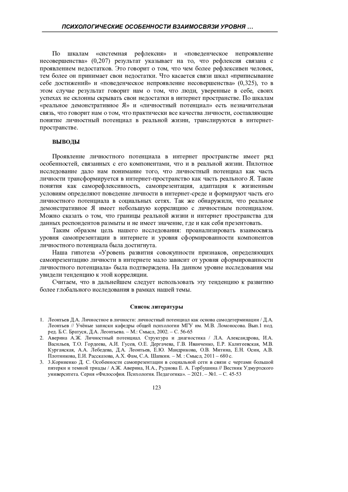3. Корниенко Д. С. Особенности самопрезентации в социальной сети в связи с чертами большой пятерки и темной триады / А.Ж. Аверина, Н.А., Руднова Е. А. Горбушина // Вестник Удмуртского университета. Серия “Философия. Психология. Педагогика”. - 2021. - №1. - С. 45-53. EDN: TYPCHG