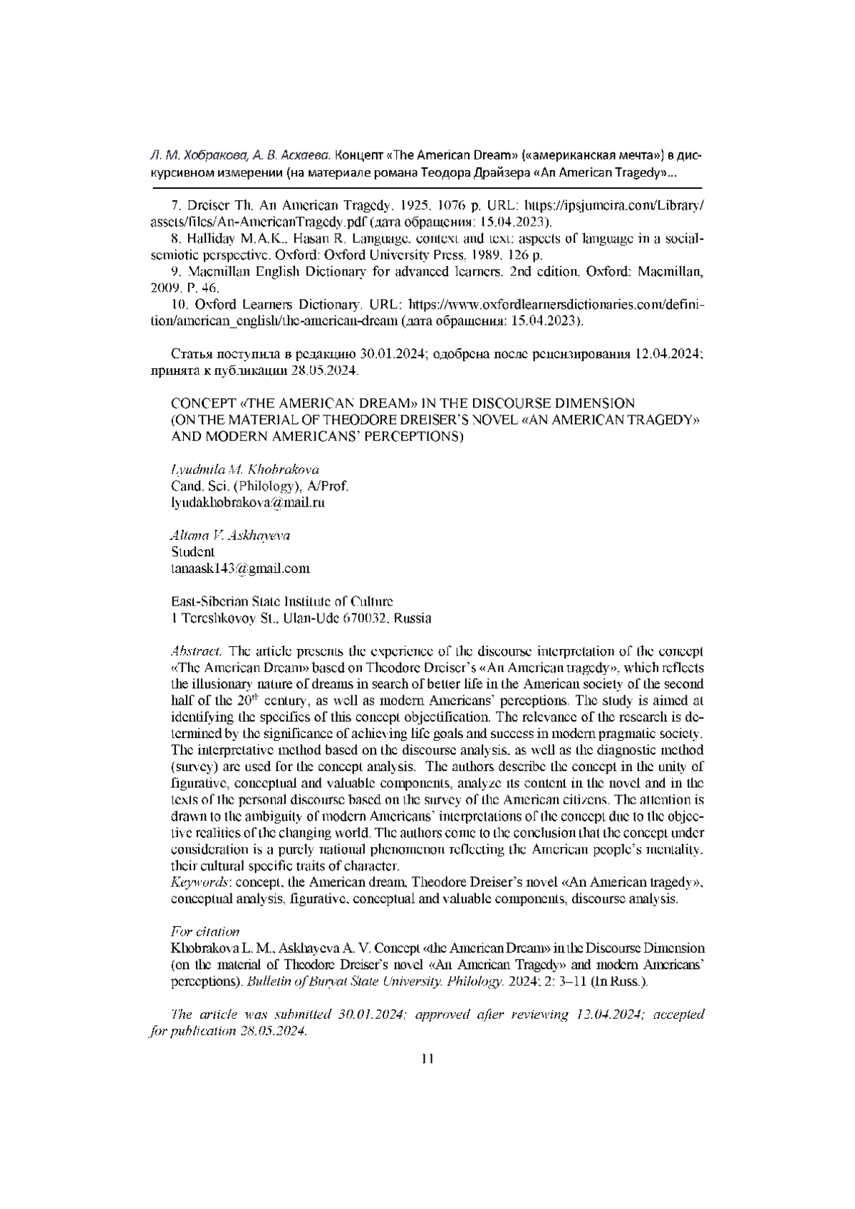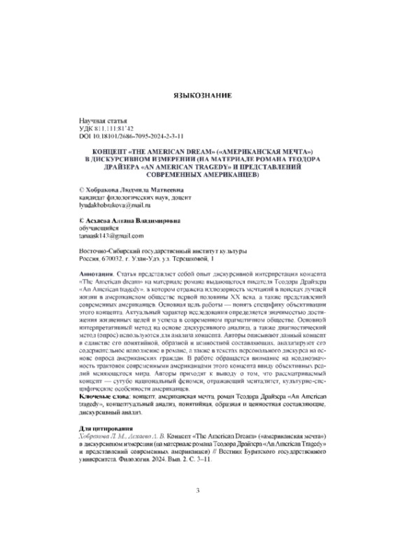 Статья представляет собой опыт дискурсивной интерпретации концепта «The American dream» на материале романа выдающегося писателя Теодора Драйзера «An American tragedy», в котором отражена иллюзорность мечтаний в поисках лучшей жизни в американском обществе первой половины XX века, а также представлений современных американцев. Основная цель работы - понять специфику объективации этого концепта. Актуальный характер исследования определяется значимостью достижения жизненных целей и успеха в современном прагматичном обществе. Основной интерпретативный метод на основе дискурсивного анализа, а также диагностический метод (опрос) используются для анализа концепта. Авторы описывают данный концепт в единстве его понятийной, образной и ценностной составляющих, анализируют его содержательное наполнение в романе, а также в текстах персонального дискурса на основе опроса американских граждан. В работе обращается внимание на неоднозначность трактовок современными американцами этого концепта ввиду объективных реалий меняющегося мира. Авторы приходят к выводу о том, что рассматриваемый концепт - сугубо национальный феномен, отражающий менталитет, культурно-специфические особенности американцев.
