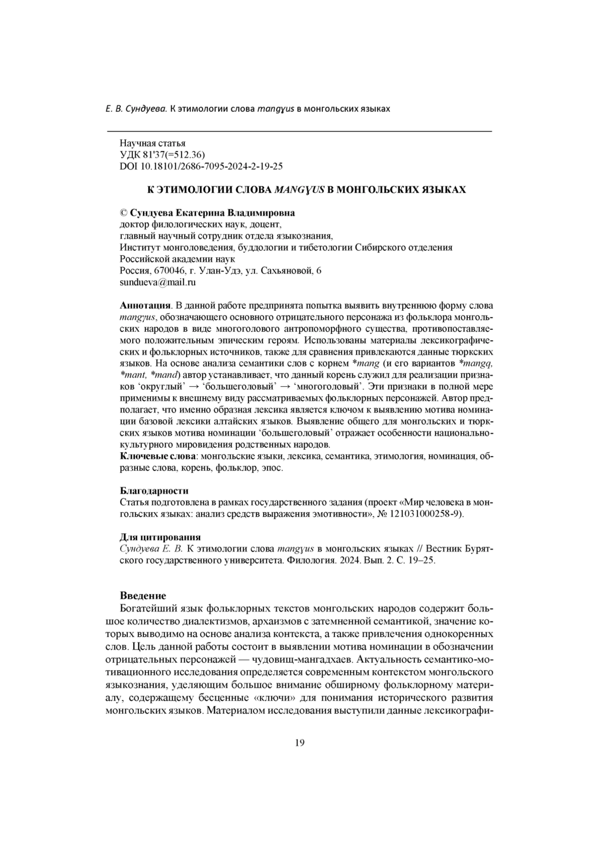 В данной работе предпринята попытка выявить внутреннюю форму слова mangyus, обозначающего основного отрицательного персонажа из фольклора монгольских народов в виде многоголового антропоморфного существа, противопоставляемого положительным эпическим героям. Использованы материалы лексикографических и фольклорных источников, также для сравнения привлекаются данные тюркских языков. На основе анализа семантики слов с корнем *mang (и его вариантов *mangq, *mant, *mand) автор устанавливает, что данный корень служил для реализации признаков ‘округлый’ → ‘большеголовый’ → ‘многоголовый’. Эти признаки в полной мере применимы к внешнему виду рассматриваемых фольклорных персонажей. Автор предполагает, что именно образная лексика является ключом к выявлению мотива номинации базовой лексики алтайских языков. Выявление общего для монгольских и тюркских языков мотива номинации ‘большеголовый’ отражает особенности национально -культурного мировидения родственных народов.