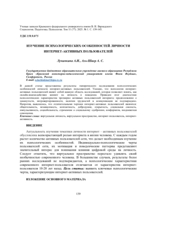 8. Лучинкина А.И. Особенности интернет-социализации на основном этапе: интернет-дикари и хакеры / А.И. Лучинкина // Ученые записки Крымского инженерно-педагогического университета. Серия: Педагогика. Психология. - 2018. - № 3 (13). - С. 40-45. EDN: YSUQST