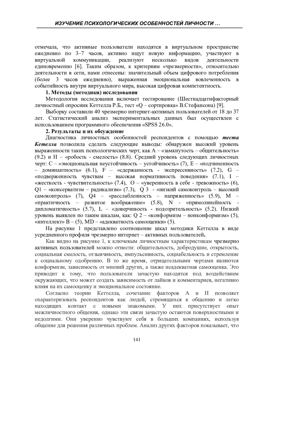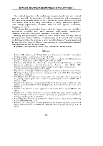 2. Расина Э.О. Индекс виртуализации личности интернет-пользователя социальных сервисов: апробация психометрической методики / Э.О. Расина // СибСкрипт. - 2023. - Т. 25, № 2 (96). - С. 228-234. EDN: KVJCBU