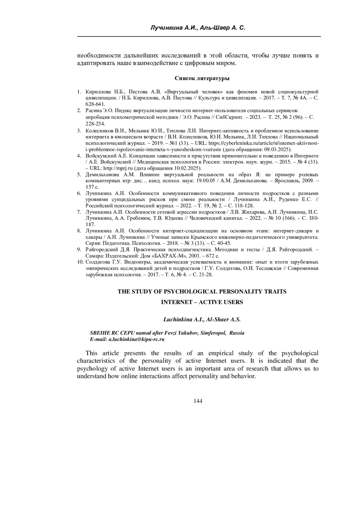 6. Лучинкина А.И. Особенности коммуникативного поведения личности подростков с разными уровнями суицидальных рисков при смене реальности / Лучинкина А.И., Руденко Е.С. // Российский психологический журнал. - 2022. - Т. 19, № 2. - С. 118-128. EDN: YFPHEF