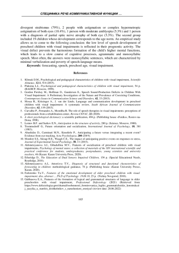 Анализ современных отечественных и зарубежных исследований позволяет прийти к выводу о взаимосвязи процесса прогнозирования и социализации: способность детей предвосхищать события будущего является ресурсом их успешной адаптации в социуме. Целью работы являлось изучение рече-коммуникативной функции прогнозирования у детей с нарушениями зрения. Нами была использована методика «Прогностические истории», разработанная преподавателями Казанского федерального университета, позволяющая выявить способности детей дошкольного возраста прогнозировать развитие событий в различных сферах взаимодействия. В исследовании приняли участие 38 детей в возрасте от 5 до 7 лет (19 детей с нарушениями зрения и 19 детей без патологии зрения). Выявлены низкие показатели критерий рече-коммуникативной функции прогнозирования у детей с нарушениями зрения, проявляющиеся главным образом в односложной речи и аграмматизмах.