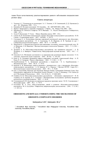 7. Сагалакова О. А. Когнитивные факторы нарушений психической деятельности при обсессивно-компульсивном расстройстве / О. А. Сагалакова, О. В. Жирнова, Д. В. Труевцев [и др.] // Сибирский психологический журнал. - 2020. - № 75. - С. 159-180. EDN: NRMJMH