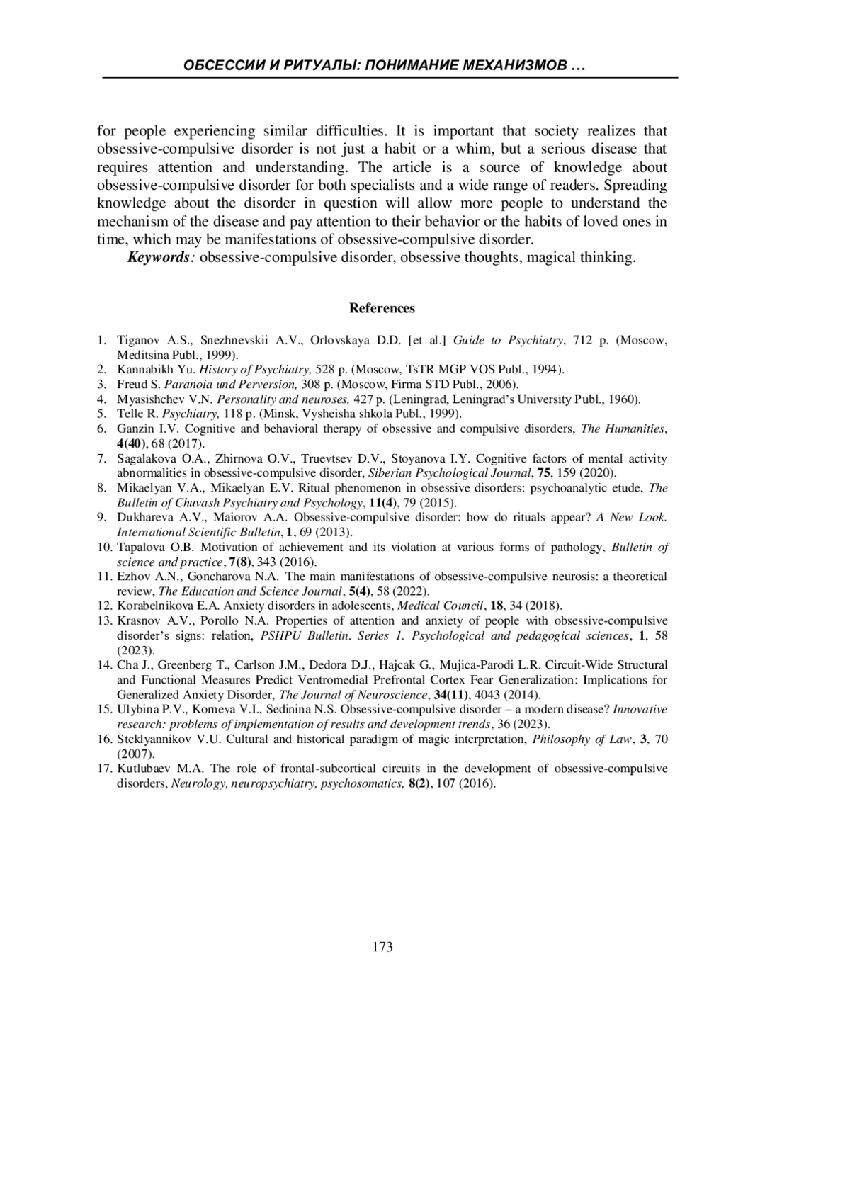 15. Улыбина П. В. Обсессивно-компульсивное расстройство - заболевание современности? / П. В. Улыбина, В. И. Корнева, Н. С. Сединина // Инновационные исследования: проблемы внедрения результатов и тенденции развития. - 2023. - С. 36-42.