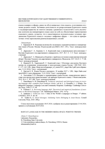 2. Дырхеева Г. А., Буркина А. А. Бурятский язык и национальная интеллигенция // Вестник Бурятского государственного университета. 2017. № 3. С. 3-9. Текст: непосредственный. EDN: YLEAKF