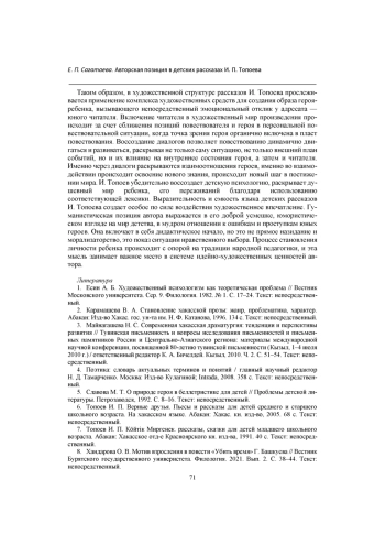 Статья посвящена выявлению авторской позиции в рассказах для детей хакасского детского писателя И. П. Топоева. Выявляются особенности структуры детских рассказов. Определяется авторская установка на диалог с адресатом - юным читателем - через сближение в определенных ситуациях позиций автора и героя. Авторская позиция прослеживается в использовании субъективированного повествования, во включении в повествовательную ткань произведения ритмико-интонационного строя речи героя-ребенка, присущей ему лексики. Устанавливается важная роль диалога героев в структуре рассказов для детей. Выявляется художественное мастерство писателя, имеющего опыт создания драматических произведений, в построении диалогов. Авторская позиция И. Топоева формируется на основе глубокого понимания закономерностей детской психологии, она прослеживается в сочетании детского взгляда на мир с позицией взрослого и мудрого наставника. Здесь возникает особое юмористическое отношение автора к миру детства. Установка на назидание и воспитание реализуется в композиционной структуре рассказов для детей, в создании ситуации нравственного выбора.