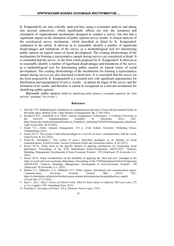 В статье рассмотрена категория «общественное мнение». Показаны некоторые причины семантической неоднозначности этой категории с позиций системного подхода. Проведен критический анализ механизма социологического опроса, подробно описанного K. Криппендорфом. С использованием системного подхода аргументировано выделен ряд существенных недостатков опроса как инструмента выявления общественного мнения. Сделан вывод о том, что опрос, в том виде, который предложен K. Криппендорфом, - как исследовательский инструмент- не является релевантным механизмом для выявления общественного мнения.