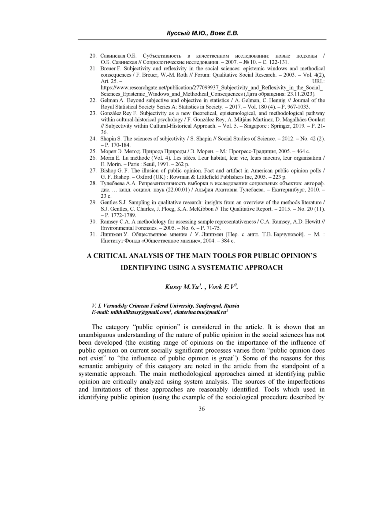 6. Куссый М.Ю. Некоторые заметки о специфических особенностях применения механизмов исследований социальных феноменов / М.Ю. Куссый // Анализ, моделирование, управление, развитие социально-экономических систем: сборник научных трудов ХVII Международной школы-симпозиума АМУР-2023 (Симферополь-Судак, 14-27 сентября 2023) / ред. совет: А. В. Сигал (предс.) и др. - Симферополь: ИП Корниенко А. А., 2023. - С. 232-240. EDN: SWMYGS