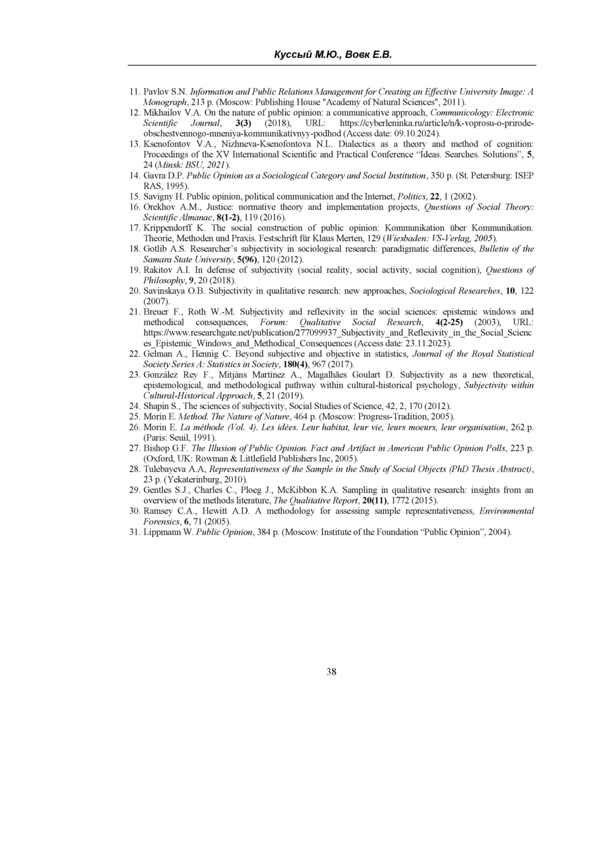 12. Михайлов В.А. К вопросу о природе общественного мнения: коммуникативный подход / В.А. Михайлов // Коммуникология: электронный научный журнал. - 2018. - Т. 3, № 3. - URL: https://cyberleninka.ru/article/n/k-voprosu-o-prirode-obschestvennogo-mneniya-kommunikativnyy-podhod (Дата обращения: 09.10.2024). EDN: YUOHIT