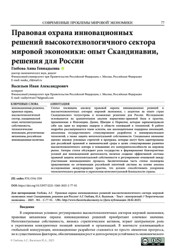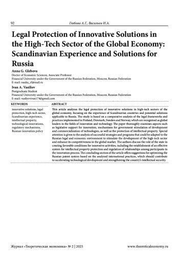 Статья посвящена анализу правовой охраны инновационных решений в высокотехнологичных секторах мировой экономики, с акцентом на опыте стран Скандинавского полуострова и возможных решениях для России. Исследование основывается на сравнительном анализе нормативно-правовой базы и практик, применяемых в Финляндии, Дании, Швеции и Норвегии, которые зарекомендовали себя как одни из мировых лидеров в области инноваций и технологий. В работе подробно рассматриваются такие аспекты, как законодательная поддержка инноваций, механизмы государственного стимулирования разработок и коммерциализации технологий, а также защита интеллектуальной собственности. Специальное внимание уделено анализу успешных стратегий и программ, которые могут быть адаптированы для российской правовой и экономической среды в целях стимулирования развития высокотехнологичного сектора и повышения его конкурентоспособности на мировом рынке. Авторы статьи обсуждают роль государства в формировании благоприятных условий для инновационной деятельности, включая создание эффективной системы правовой защиты интеллектуальной собственности и регулирование отношений между участниками инновационного процесса. Заключительная часть статьи посвящена предложениям по оптимизации российской патентной системы на основе анализа исследованных международных практик, что должно способствовать ускорению технологического развития и укреплению интеллектуальной безопасности страны.