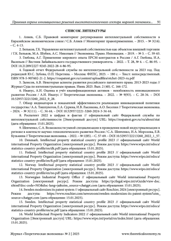 1. Алиев, С.Б. Правовой мониторинг регулирования интеллектуальной собственности в Евразийском экономическом союзе / С.Б. Алиев // Мониторинг правоприменения. - 2015. - № 3(16). - С. 4-13. EDN: VONOQV