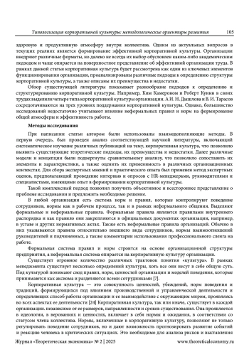 При написании статьи автором были использованы взаимодополняющие методы. В первую очередь, был проведен анализ соответствующей научной литературы, включающий систематическое изучение различных публикаций на тему, корпоративная культура, что позволило выявить существующие теоретические подходы, их преимущества и недостатки. Далее различные модели и концепции были подвергнуты сравнительному анализу, что позволило сопоставить их элементы и характеристики, а также оценить их применимость в различных организационных контекстах. Для сбора экспертных мнений и практического опыта был применен метод экспертных оценок, предполагающий проведение интервью и опросов с HR-менеджерами, руководителями и специалистами, имеющими опыт в формировании корпоративной культуры. Такой комплексный подход позволил получить объективное и всестороннее представление о проблеме исследования и предложить необходимо решение.