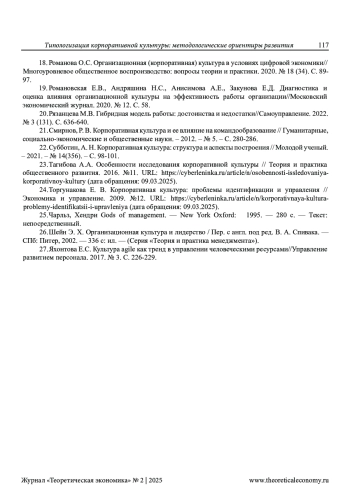 19. Романовская Е.В., Андряшина Н.С., Анисимова А.Е., Закунова Е.Д. Диагностика и оценка влияния организационной культуры на эффективность работы организации//Московский экономический журнал. 2020. № 12. С. 58. ;. DOI: 10.24411/2413-046X-2020-10856 EDN: KLOFKP