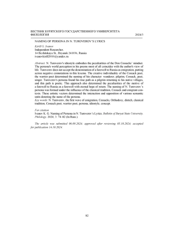 Идиостиль Н. Туроверова воплощает особенности менталитета донского казачества. Мироощущение лирического героя чаще всего совпадает с мировосприятием автора в стихотворениях. Поэт не принимает обозначение прощания с Россией как эмиграции, вкладывая в эту лексему отрицательные коннотации. Творческая индивидуальность поэта-казака, поэта-воина определила именование лирического героя: скиталец, пилигрим, казак, поэт, певец. Его герой нашел свой истинный путь пилигрима, возвращающегося к родным станицам, и это путь поэтический. Данный подход и обозначил особенности воплощения мотива прощания с Россией - прощание с вечной надеждой на возвращение. Именование лирического героя Н. Туроверова сформировалось под воздействием классической традиции, казачьего и эмигрантского контекстов. Эти художественные векторы и определили взаимодействие и оппозиция различных семантических единиц, обозначающих название лирического героя.