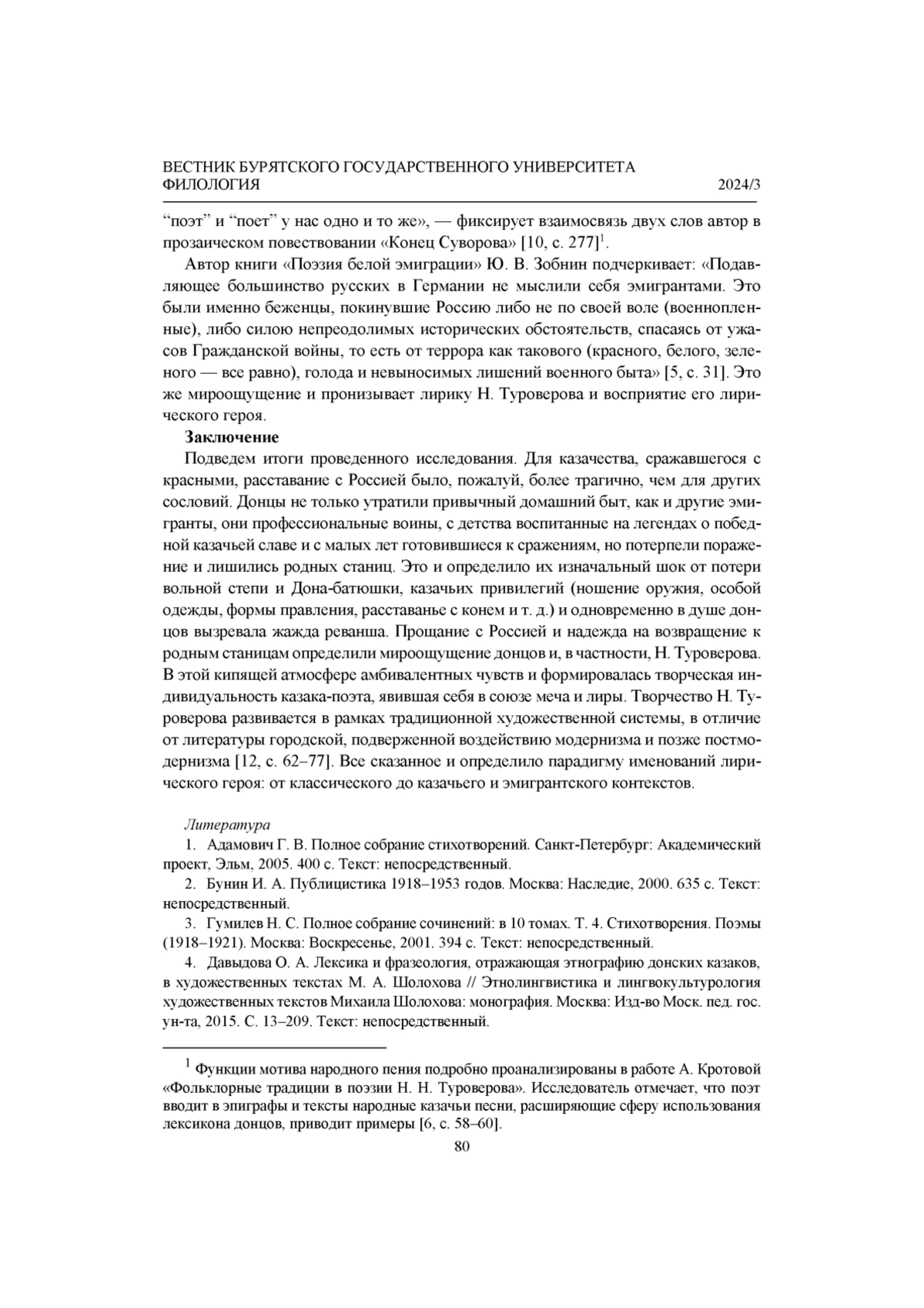 6. Кротова А. А. Фольклорные традиции в поэзии Н. Н. Туроверова: диссертация на соискание ученой степени кандидата филологических наук. Москва, 2019. 214 с. Текст: непосредственный. EDN: EVIEJF